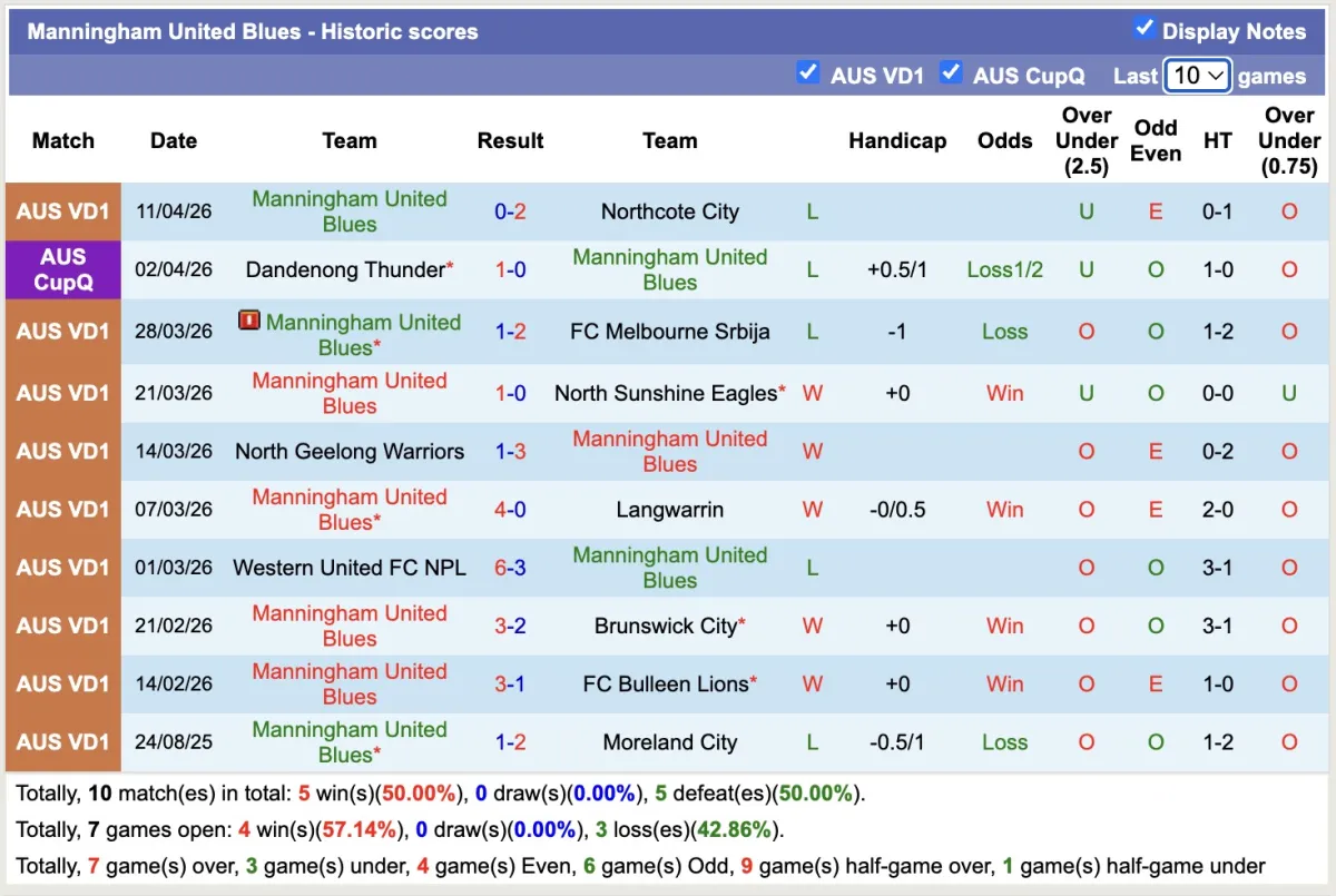 – Thống kê phong độ 10 trận gần nhất của Manningham United Blues.