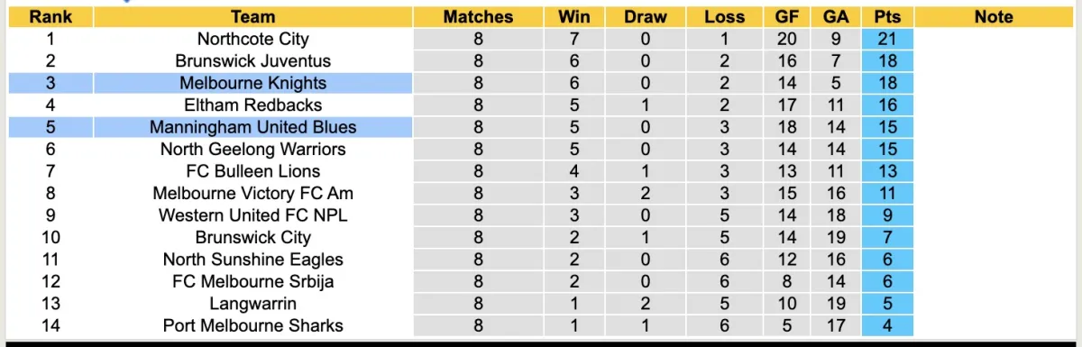 Tuy nhiên, có vẻ như Melbourne Knights đang nỗ lực hết mình để trở lại NPL Victoria, khi trong 8 vòng đấu vừa qua, đội chủ nhà chỉ để thua 2 trận và giành được tới 6 chiến thắng. Với 18 điểm trong tay, họ hiện đang đứng ở vị trí thứ 3 trên bảng xếp hạng.