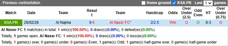 Lịch sử đối đầu cũng hoàn toàn nghiêng về đội chủ nhà Al-Awwal Park. Ở trận lượt đi, Al Nassr đã dễ dàng đánh bại đối thủ với tỷ số 5-0 ngay trên sân khách. Trong bối cảnh hiện tại, việc Al Nassr có một trận đấu bùng nổ với nhiều bàn thắng là điều gần như không thể tránh khỏi.