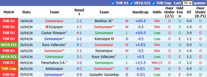 Thống kê phong độ 10 trận gần nhất của Samsunspor