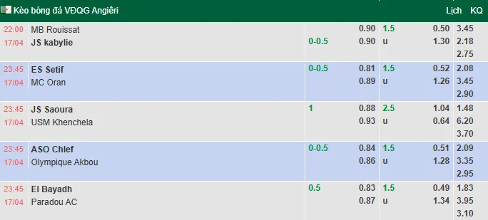 Phân tích trận đấu giữa MB Rouisset và JS Kabylie sẽ diễn ra vào lúc 22h00 ngày 17/4/2026 trong khuôn khổ giải VĐQG Algeria. Các chuyên gia hàng đầu sẽ đưa ra dự đoán và đánh giá về tỷ lệ kèo châu Âu cũng như kèo châu Á cho cuộc đối đầu này.