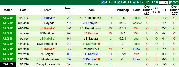 Trong lịch sử đối đầu, hai đội đã có một trận hòa 1-1 ở lượt đi (tháng 1/2026). Tuy nhiên, trong trận đó, JS Kabylie đã hoàn toàn kiểm soát thế trận nhưng lại kém may mắn trong khâu dứt điểm. Ở lần tái đấu này, sự chênh lệch về chiều sâu đội hình có thể sẽ giúp đội khách tạo ra sự khác biệt.