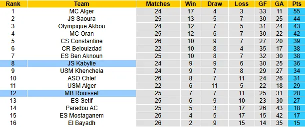 Ngược lại, JS Kabylie đang đứng ở vị trí thứ 8 trên bảng xếp hạng với 36 điểm. Mặc dù mùa giải này họ không thi đấu nổi bật để cạnh tranh ngôi vô địch, nhưng JS Kabylie vẫn luôn là một đối thủ khó chịu đối với bất kỳ đội bóng nào. Lối chơi của họ dựa vào sự chắc chắn trong phòng ngự và khả năng điều tiết trận đấu từ đội trưởng Ryad Boudebouz.