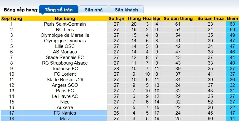 Metz đang có dấu hiệu rõ ràng sẽ trở lại giải hạng 2 ngay lập tức khi chỉ mới tích lũy được 14 điểm sau 27 vòng đấu. Đội bóng đứng chót bảng Ligue 1 đã trải qua chuỗi 15 trận không thắng liên tiếp kể từ chiến thắng 2-1 trước Nice trên sân nhà vào tháng 11/2025.
