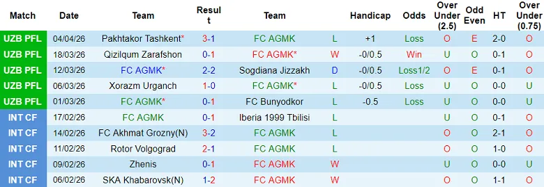 Bốn điểm mà AGMK có được đến từ 3 trận đấu gần đây: thắng 1, hòa 1 và thua 1. Điều này cho thấy rằng đội bóng do HLV Mirdzhalol Kasymov dẫn dắt đã trải qua 2 trận thua liên tiếp trong 2 vòng đấu đầu tiên của mùa giải Uzbekistan Super League năm nay.