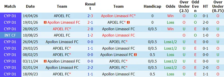 Từ tháng 5/2005 đến nay, Apollon đã có 38 lần tiếp đón APOEL trên mọi mặt trận. Apollon giành được 17 chiến thắng, hơn 5 trận so với 12 chiến thắng của APOEL. Còn lại, hai đội đã hòa nhau 9 lần.