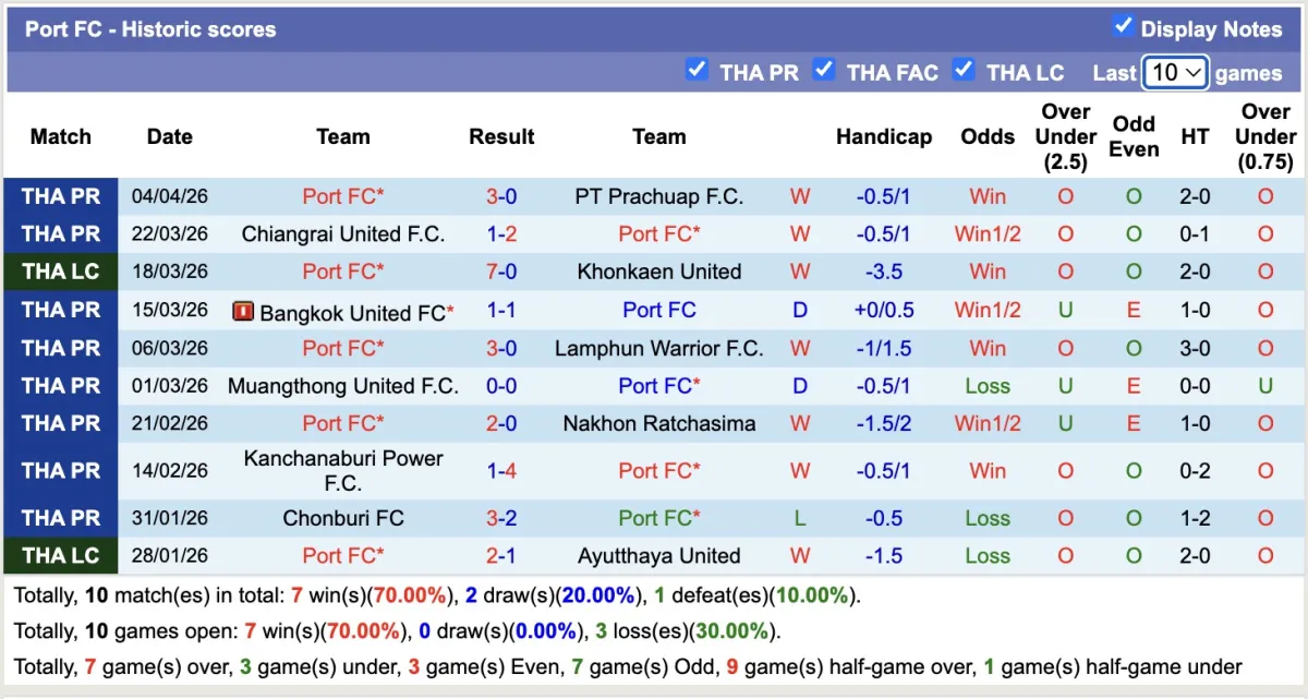 – Thống kê phong độ 10 trận đấu gần nhất của Port