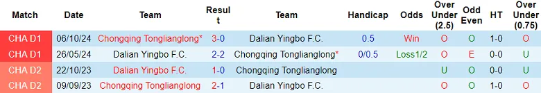 Trong lịch sử đối đầu, Chongqing Tonglianglong và Dalian Yingbo đã gặp nhau 4 lần, tất cả đều không thuộc khuôn khổ Chinese Super League. Dalian Yingbo chỉ có 1 chiến thắng, ít hơn Chongqing Tonglianglong 1 trận (2 chiến thắng). Trận đấu còn lại kết thúc với tỷ số hòa.