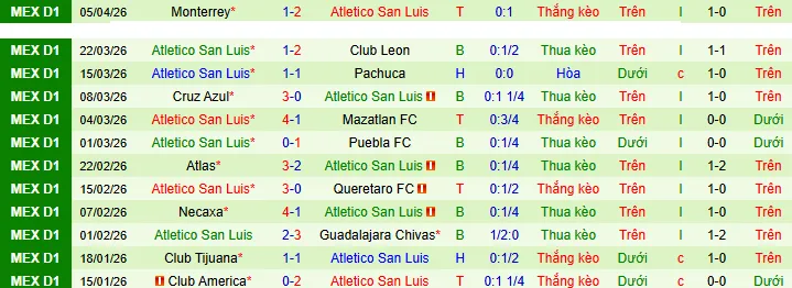 + San Luis thắng 3, thua 6 và hòa 1 trong 10 trận gần nhất ở giải VĐQG.