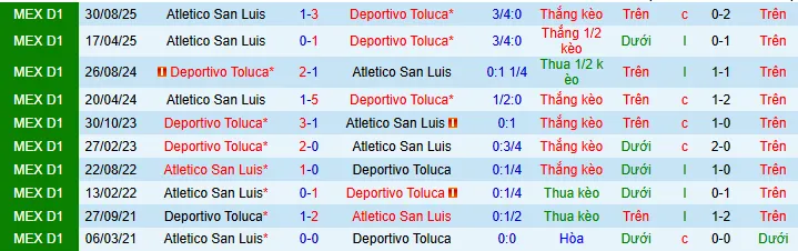 + Toluca thắng 6 và thua 2 trong 8 trận đối đầu gần nhất với San Luis theo kèo châu Á.