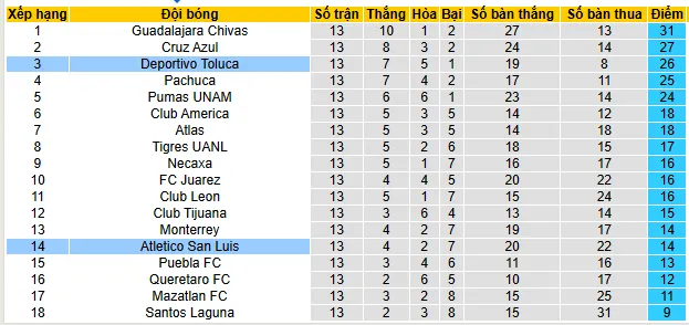San Luis đang gặp khó khăn, hiện đứng thứ 14 với chỉ 14 điểm. Đội bóng này đã có 4 chiến thắng, 2 trận hòa và 7 thất bại, ghi được 20 bàn và để thủng lưới 22 bàn. Thành tích này cho thấy phong độ không ổn định, đặc biệt là ở hàng phòng ngự.