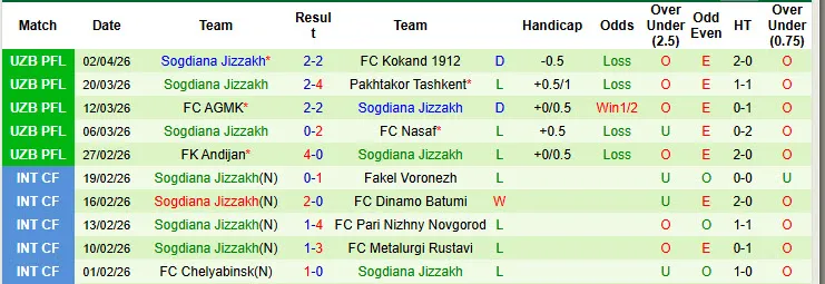 Thống kê phong độ 10 trận đấu gần nhất của Sogdiana Jizzakh