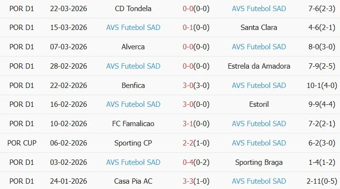 Thống kê phong độ 10 trận đấu gần nhất của AVS Futebol SAD
