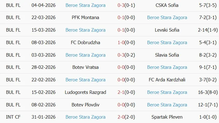Thống kê phong độ 10 trận đấu gần nhất của Beroe Stara Zagora