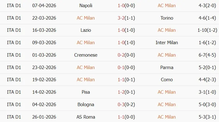 Thống kê phong độ 10 trận đấu gần nhất của AC Milan