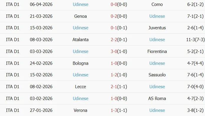 Thống kê phong độ 10 trận đấu gần nhất của Udinese