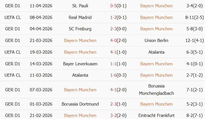 Thống kê phong độ 10 trận đấu gần nhất của Bayern Munich