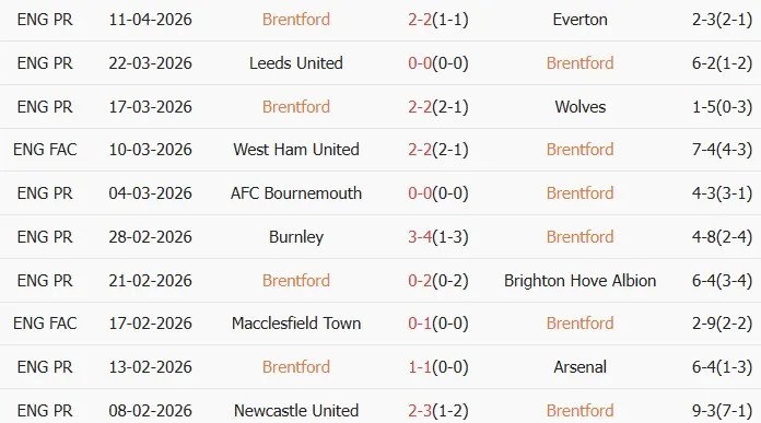 Thống kê phong độ 10 trận đấu gần nhất của Brentford