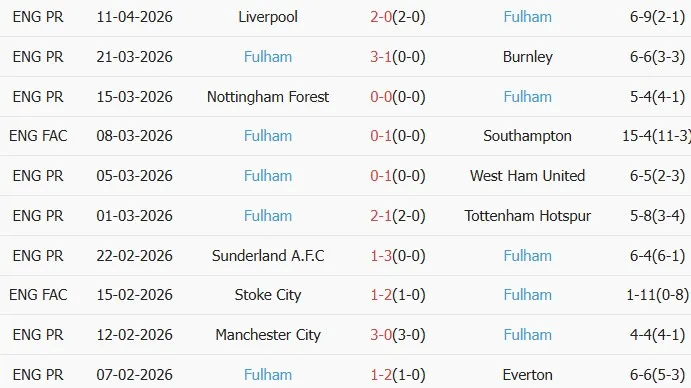 Thống kê phong độ 10 trận đấu gần nhất của Fulham