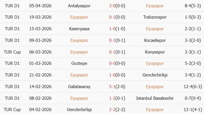 Thống kê phong độ 10 trận đấu gần nhất của Eyupspor