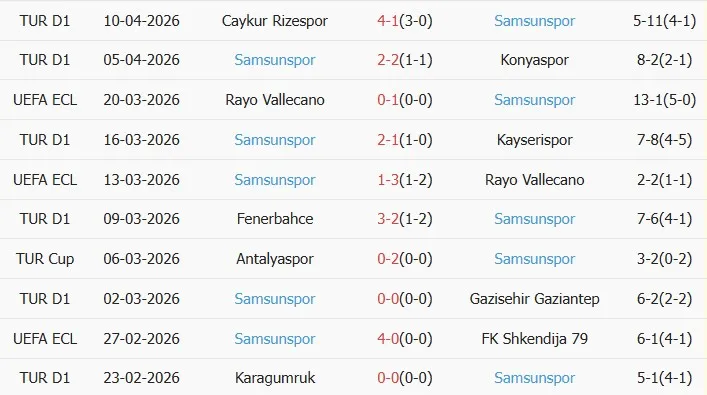 Thống kê phong độ 10 trận đấu gần nhất của Samsunspor