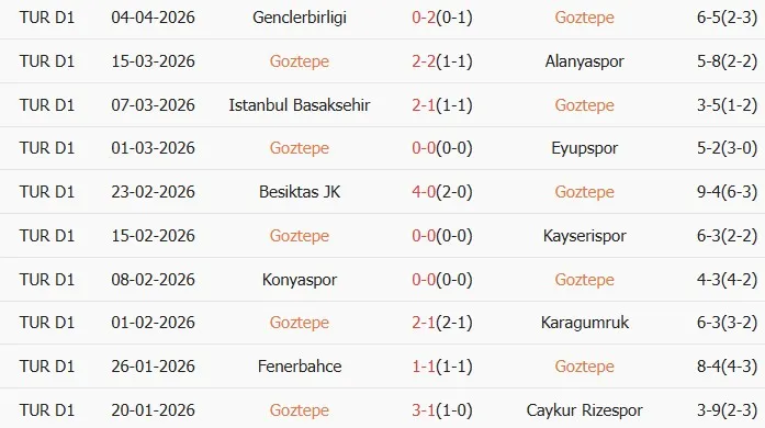 Thống kê phong độ 10 trận đấu gần nhất của Goztepe