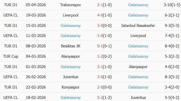 Thống kê phong độ 10 trận đấu gần nhất của Galatasaray