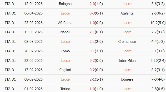 Thống kê phong độ 10 trận đấu gần nhất của Lecce