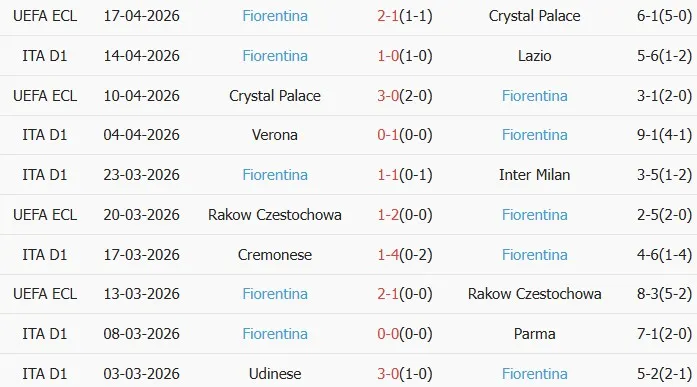 Thống kê phong độ 10 trận đấu gần nhất của Fiorentina