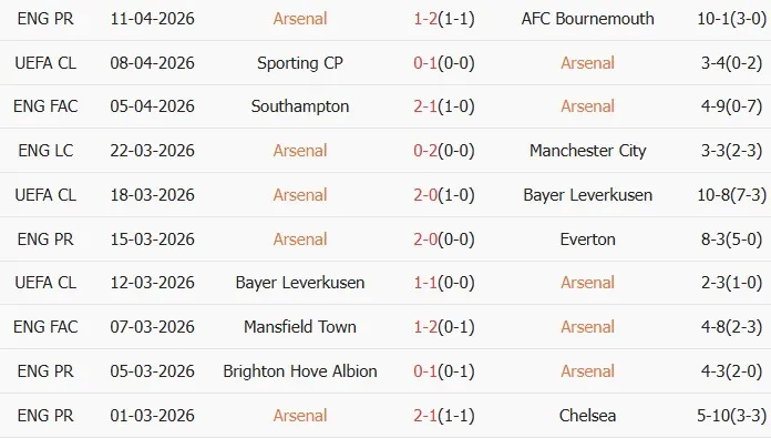 Thống kê phong độ 10 trận đấu gần nhất của Arsenal