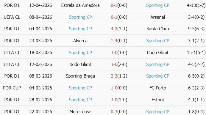 Thống kê phong độ 10 trận đấu gần nhất của Sporting CP