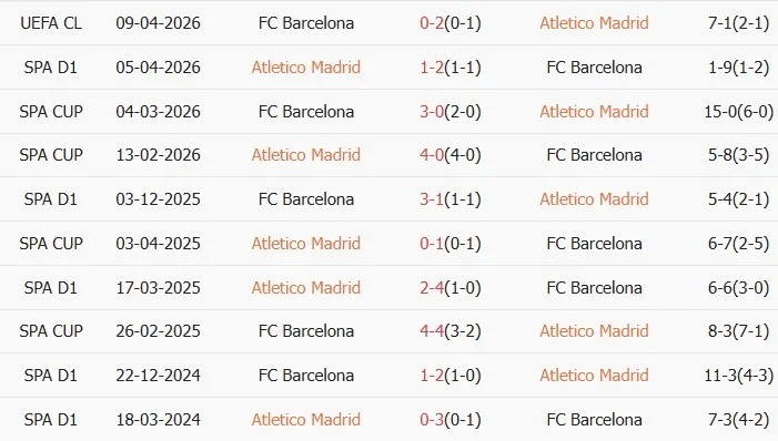 Thống kê phong độ, lịch sử đối đầu của Atletico Madrid vs Barcelona