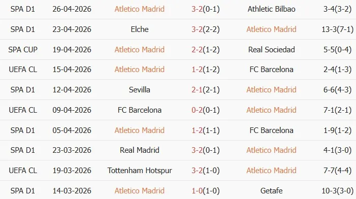 Thống kê phong độ 10 trận đấu gần nhất của Atletico Madrid