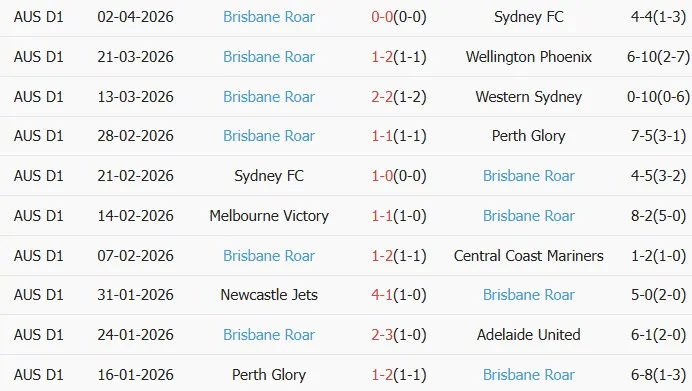 Thống kê phong độ 10 trận đấu gần nhất của Brisbane Roar