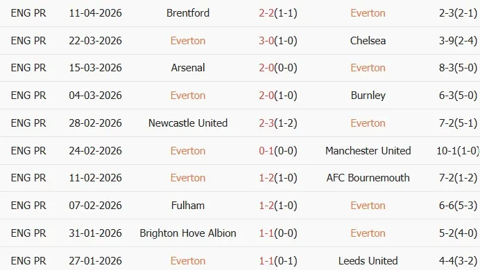 Thống kê phong độ 10 trận đấu gần nhất của Everton