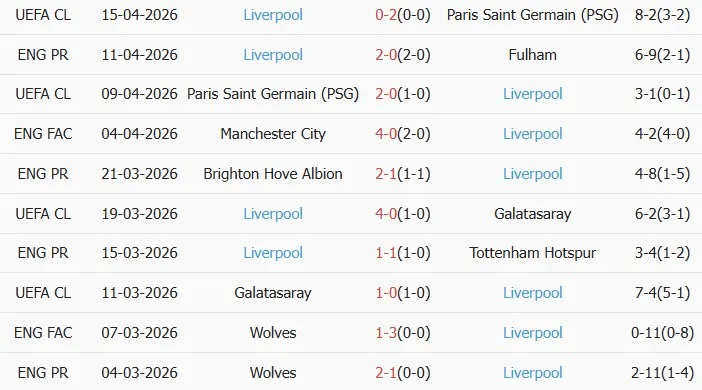 Thống kê phong độ 10 trận đấu gần nhất của Liverpool