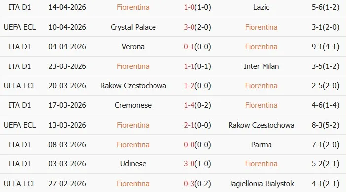 Thống kê phong độ 10 trận đấu gần nhất của Fiorentina