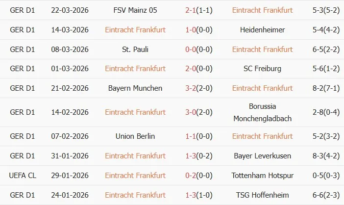Thống kê phong độ 10 trận đấu gần nhất của Frankfurt