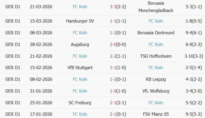 Thống kê phong độ 10 trận đấu gần nhất của Koln