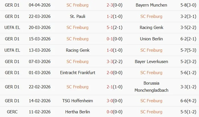 Thống kê phong độ 10 trận đấu gần nhất của Freiburg