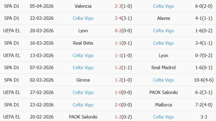 Thống kê phong độ 10 trận đấu gần nhất của Celta Vigo