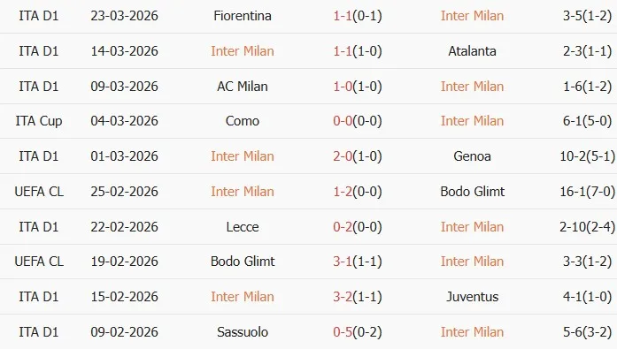 Thống kê phong độ 10 trận đấu gần nhất của Inter Milan