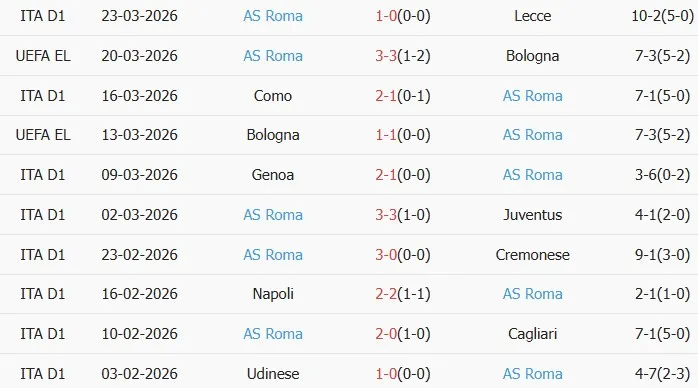Thống kê phong độ 10 trận đấu gần nhất của AS Roma