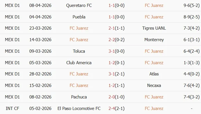 Thống kê phong độ 10 trận đấu gần nhất của Juarez