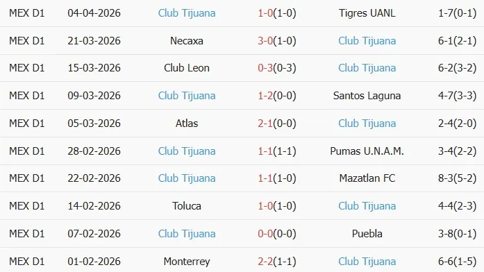 Thống kê phong độ 10 trận đấu gần nhất của Club Tijuana