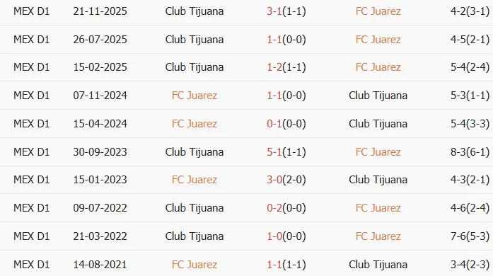 Thống kê phong độ, lịch sử đối đầu của Juarez vs Club Tijuana