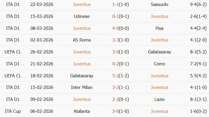 Thống kê phong độ 10 trận đấu gần nhất của Juventus