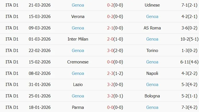 Thống kê phong độ 10 trận đấu gần nhất của Genoa