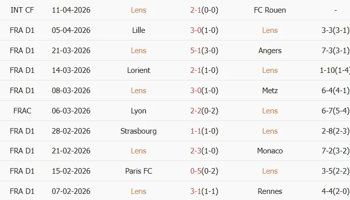 Thống kê phong độ 10 trận đấu gần nhất của Lens