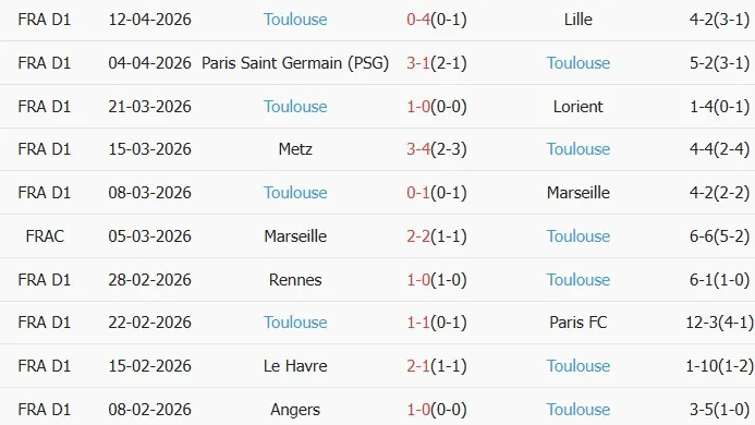 Thống kê phong độ 10 trận đấu gần nhất của Toulouse